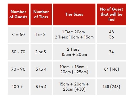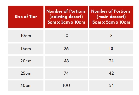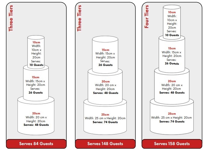 Cake layers are cut at a standard height of 4cm and filled with a 1cm layer of filling between each cake layer.